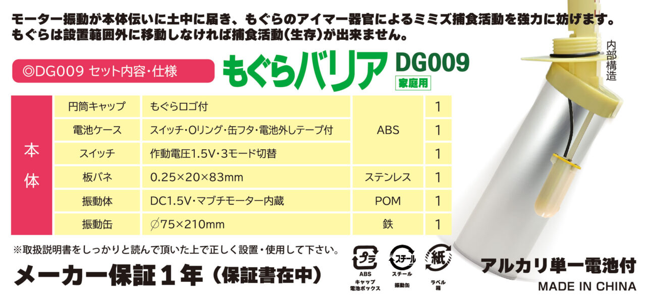 「もぐらバリア DG009」は地中に強力な振動を伝える事によって、ミミズの微弱な振動をキャッチして捕食しているもぐらの活動が妨げられ、強力振動の影響のない所へと活動範囲を移します。